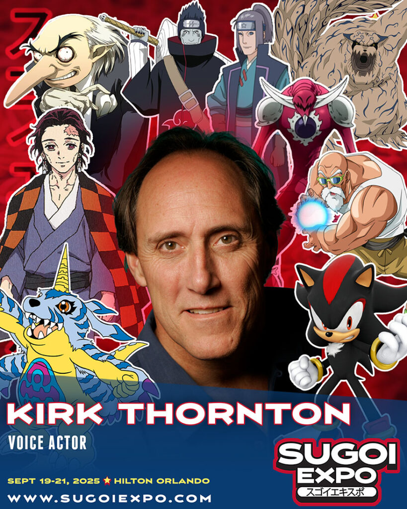 Kirk Thornton is a voice actor, director and script writer. His major roles include Brandon Heat in Gungrave, Hotohori in Fushigi Yūgi, Klein in Sword Art Online, Jin in Samurai Champloo, Anavel Gato in Gundam 0083: Stardust Memory, Hajime Saito in Rurouni Kenshin, Jet Link in Cyborg 009, Don Patch in Bobobo-bo Bo-bobo, Ensign Nogami in The Cockpit and numerous Digimon. Additionally, Thornton co-directed for the anime series Bleach alongside Wendee Lee and also serves as the narrator. In video games, he voices Organization XIII member Saïx in the Kingdom Hearts series and Shadow the Hedgehog and Orbot in the Sonic the Hedgehog series.